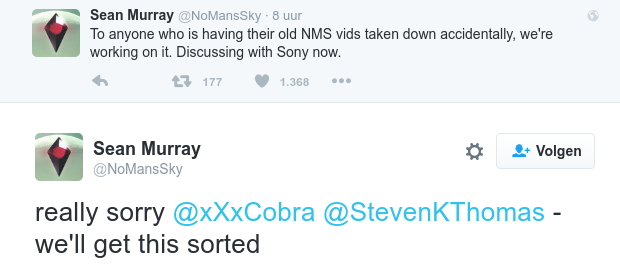 Op Twitter heeft Sean Murray, oprichter van Hello Games en bedenker van No Man's Sky, aangegeven dat er samen met Sony aan gewerkt wordt om de per ongeluk verwijderde video's zo snel mogelijk weer online te krijgen en de YouTubers weer hun kanalen te laten beheren.