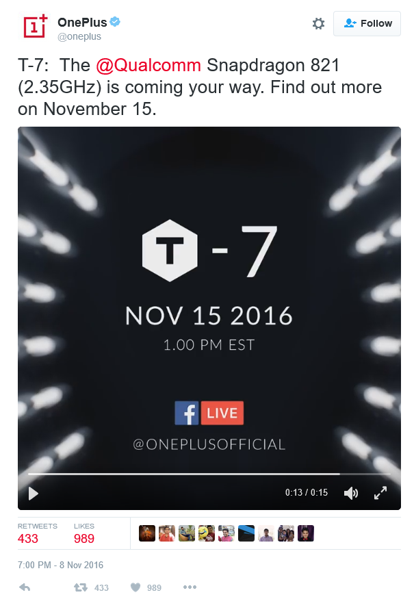 Allereerst spreekt Qualcomm er op maandag van dat 'iets nieuws van OnePlus onderweg is en het wordt aangedreven door onze Snapdragon 821-processor'. Een dag later, op dinsdagavond, laat OnePlus weten dat 'de Snapdragon 821 onderweg is' en zegt dat men meer zal komen te weten op 15 november. Aangezien OnePlus een rol speelt in deze 'onthulling' van de 821 en het bedrijf werkt aan een nog niet onthulde smartphone met een Snapdragon 821 aan boord, is het waarschijnlijk dat het hier gaat om de OnePlus 3T.
