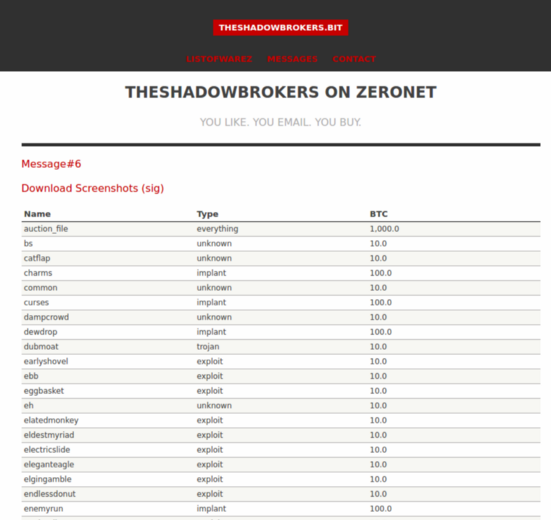 De data wordt door de Shadowbrokers te koop aangeboden op een site op het gedecentraliseerde ZeroNet. Eerder waren de gegevens via een veiling te koop, maar daarmee hadden de Shadowbrokers geen succes. De losse gegevens, waaronder de exploits, zijn nu direct te koop voor bedragen tussen de 1 en 100 bitcoin, omgerekend tussen de 758 en 75.800 euro. De gehele verzameling is te koop voor 1000 bitcoin.