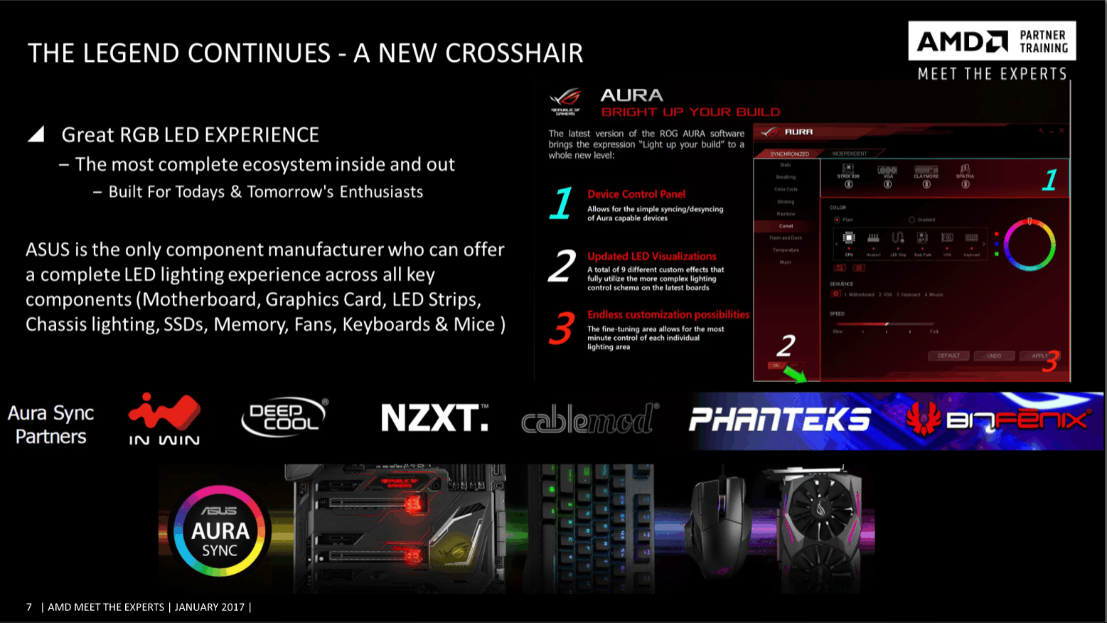 Ook krijgt het Crosshair-moederbord twee headers voor het Asus Aura rgb-systeem en een ess sabre-dac, die voor hoge audiokwaliteit moet zorgen. Er is ondersteuning voor nvme-ssd's in m2-formfactor en een frontheader met usb 3.1. In de presentatie is ook de Prime X370 van Asus te zien. Dat is volgens de begeleidende tekst een 'mainstream'-model. Dit moederbord heeft één Aura-header en is ook geschikt om Ryzen-processors over te klokken.