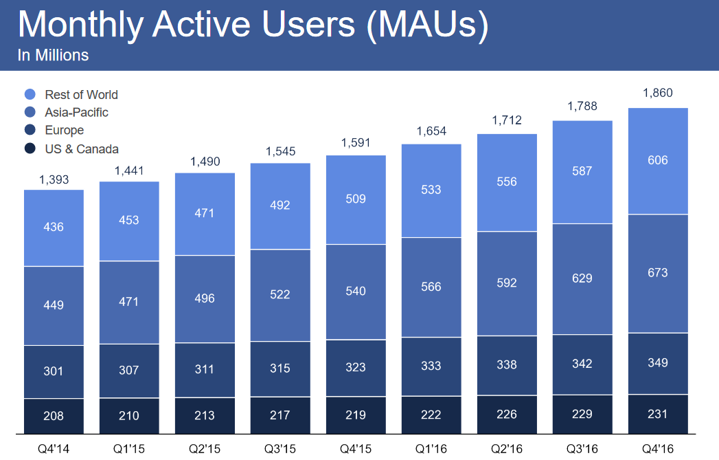 In het vierde kwartaal van 2016 behaalde Facebook een advertentieomzet van 8,6 miljard dollar. Een stijging van 53 procent jaar op jaar. De winst kwam uit op 3,7 miljard dollar. Gedurende heel 2016 had Facebook een omzet van 26,9 miljard dollar en een winst van 10,2 miljard dollar, omgerekend zo'n 9,5 miljard euro. Zowel de omzet als de winst is flink gestegen ten opzichte van 2015. Toen werd er een omzet van 17 miljard dollar behaald en kwam de winst uit op 3,7 miljard dollar. Het grootste deel van de inkomsten krijgt Facebook uit mobiele advertenties. Dat was in het afgelopen kwartaal 84 procent. In de vorige twee kwartalen was dat percentage hetzelfde.