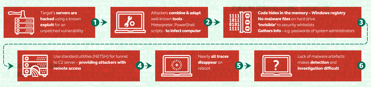 De onderzoekers kwamen de aanvallen op het spoor toen een bank Meterpreter-code in het geheugen van een domeincontroller aantrof. Zij kwamen erachter dat door een PowerShell-script in het Windows-register de Meterpreter-payload in het geheugen van het systeem was geladen. Ook was er een kwaadaardig proces aangemaakt met het standaard-Windows-onderdeel SC. Vervolgens werd een ander standaardonderdeel, NETSH, gebruikt om verbinding te maken met een command and control-server. Om de daarvoor benodigde beheerdersrechten te verkrijgen, maakten de aanvallers gebruik van Mimikatz.