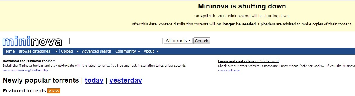 Het in Utrecht gevestigde Mininova heeft op de website een bericht geplaatst dat het op 4 april gaat sluiten. Torrents zullen na deze datum niet meer worden geseed. In het bericht roept Mininova uploaders op om back-ups te maken van hun content.