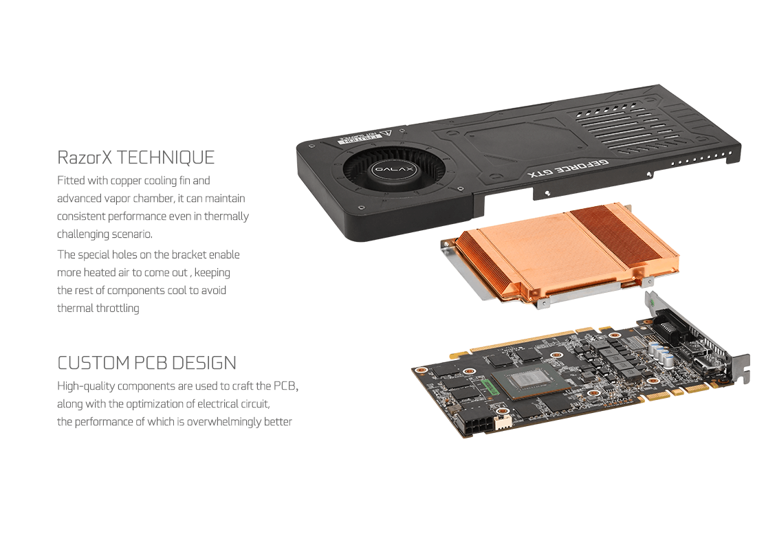 Galax spreekt over een 'turbo radiator' en doelt daarmee op de radiale fan die de lucht over het koperen koelblok met vapor chamber blaast. Het ontwerp van de koeler is vergelijkbaar met de Founders Edition van de GTX 10-kaarten, maar dan een stuk dunner. De fabrikant geeft geen informatie over de koelprestaties of geluidsdruk van de kaart.