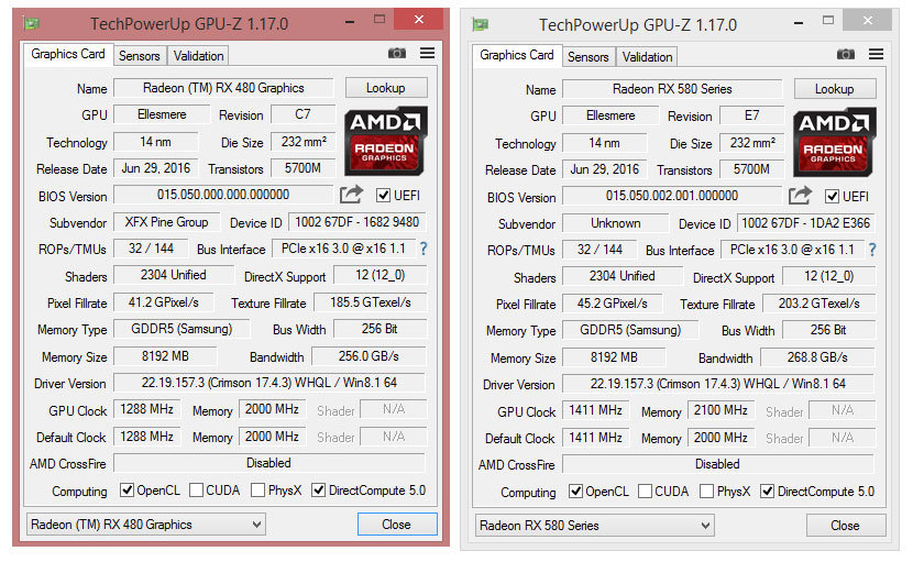 GPU-Z-gegevens van de XFX RX 480-videokaart voor en na de biosflash