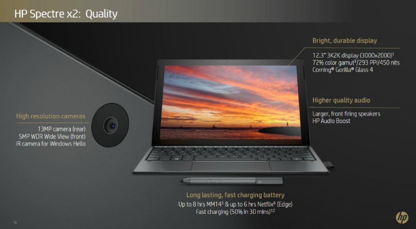 Verder heeft het 12,3"-scherm van de Spectre nu een beeldverhouding van 3:2 in plaats van 16:9. De resolutie is 3000x2000 pixels. Ten opzichte van de voorganger zijn er grotere luidsprekers en er is een snellaadfunctie voor het in een halfuur laden van de helft van de capaciteit. Het model beschikt over Intel Kaby Lake-processors, tot aan 16GB lpddr3 en maximaal 1TB pci-e-ssd-opslag. Het apparaat heeft verder twee usb 3.1 type c-poorten en een geheugenkaartsleuf. De adviesprijs is 1599 euro en voor die prijs levert HP een N-Trig-stylus mee.