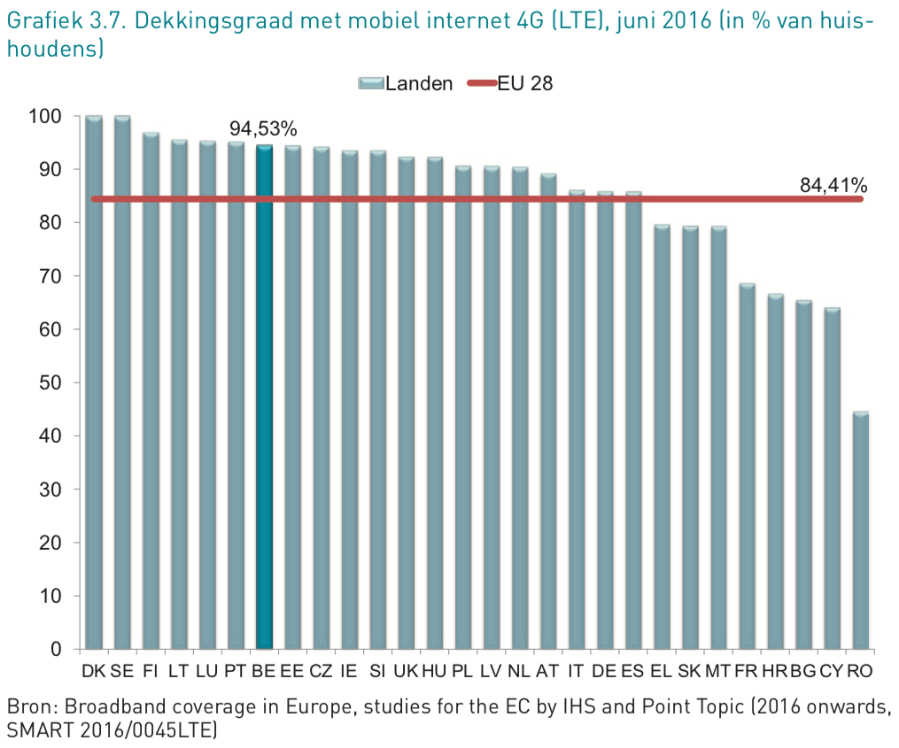 Met de dekking van 94,5 procent van de huishoudens die over 4g kunnen beschikken, staat België op plek 7 van de 28 Europese lidstaten, boven buurlanden als Nederland, Frankrijk en Duitsland. Volgens de overheidsdienst FOD Economie heeft België met de uitbreiding van de 4g-dekking 'de achterstand meer dan ingehaald'. Het gemiddelde in Europa ligt op 84,41 procent.