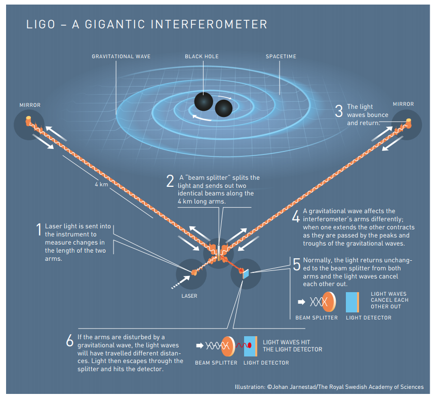 De 4km lange detectors in de VS namen twee jaar geleden Gravitation Wave 150914 waar, een van de rimpelingen die ontstonden door het versmelten van twee zwarte gaten, op ongeveer 1,3 miljard lichtjaar van de aarde. Uit de gegevens die met de detectors verzameld konden worden, bleek dat de zwarte gaten 75 keer per seconde om elkaar draaiden vlak voordat ze versmolten. De massa van het zwarte gat dat door de versmelting ontstond, was gelijk aan 62 keer de massa van de zon.