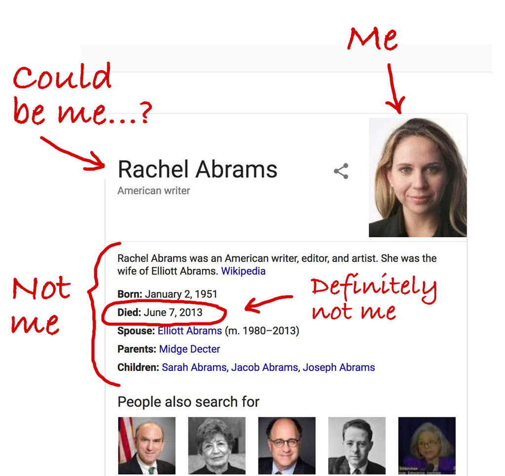 De krant vroeg bij Google naar het proces, nadat een medewerker van de krant een week lang tevergeefs had geprobeerd onjuiste informatie uit de Knowledge Graph te krijgen. Google gaf informatie weer dat zij vier jaar geleden was overleden. Die informatie ging over iemand anders met dezelfde naam. Daarbij stond wel haar foto, die afkomstig is van de site van The New York Times.
