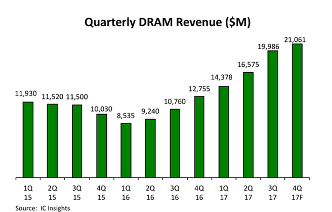 IC Insights becijfert dat de gezamenlijke omzet van dram-bedrijven eind 2017 wel eens 65 procent hoger kan liggen dan eind 2016. De prijsstijgingen zijn het gevolg van toegenomen vraag, vooral voor smartphones, en achterblijvende productieverhogingen. Volgens Reuters speelt mee dat Chinese fabrikanten moeite hebben om de productie van 3d-nand op peil te krijgen.