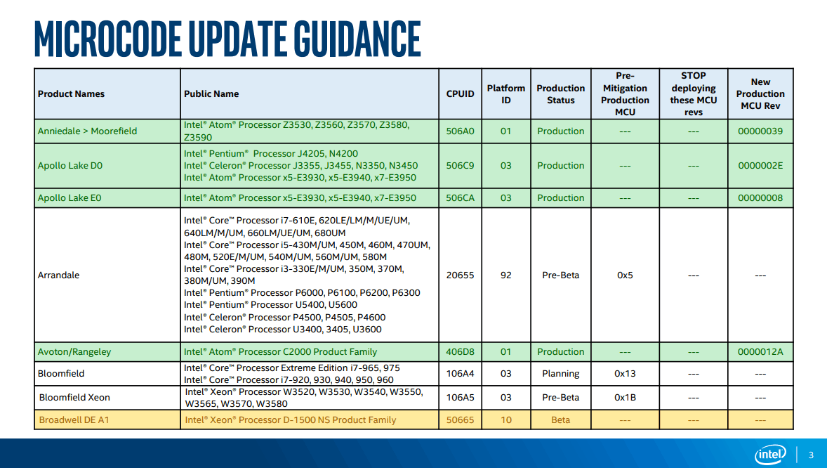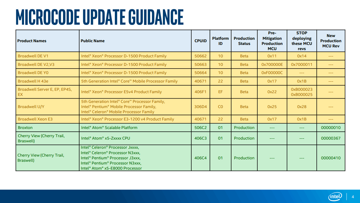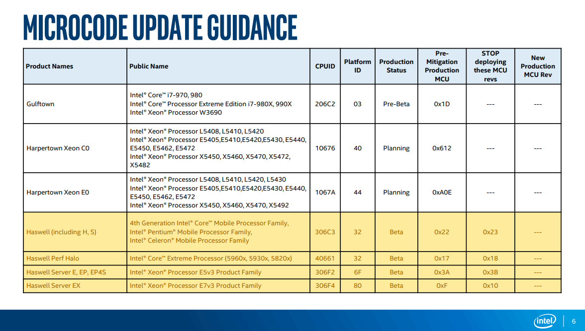 De chipmaker heeft bovendien een planning gepubliceerd voor microcode-updates. Daaruit is op te maken dat patches voor bijvoorbeeld Broadwell- en Haswell-cpu's zich in de bètafase bevinden. Tot nu toe waren er steeds alleen periodieke updates vanuit het bedrijf over microcodepatches voor bepaalde processors.