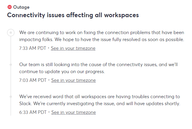 Slack meldt op zijn site en op Twitter dat er problemen zijn met 'verbindingen'. De storing begon rond 15:30. In zijn laatste update laat het bedrijf weten dat het eraan werkt de oorzaak van de problemen te achterhalen. Het meldt zo snel mogelijk weer online te willen zijn, maar noemt geen schatting.