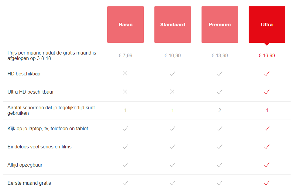 Zo biedt het Premium-abonnement op dit moment nog de mogelijkheid om op vier schermen tegelijkertijd naar Netflix te kijken, maar dat wordt verlaagd naar twee schermen met de eventuele introductie van het Ultra-abonnement. Bij het Standaard-abonnement van 10,99 euro zijn nu nog twee schermen te gebruiken, maar dat gaat terug naar één als het Ultra-abonnement er komt, zonder dat de prijs omlaag gaat.