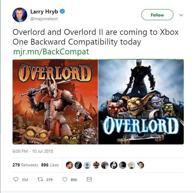 De mededeling dat de beide Overlord-games nu speelbaar zijn op de Xbox One komt van Larry Hryb, die als Major Nelson de spreekbuis is van Microsoft voor alle Xbox-zaken. Zoals gebruikelijk doet hij de mededeling in de vorm van een Tweet.