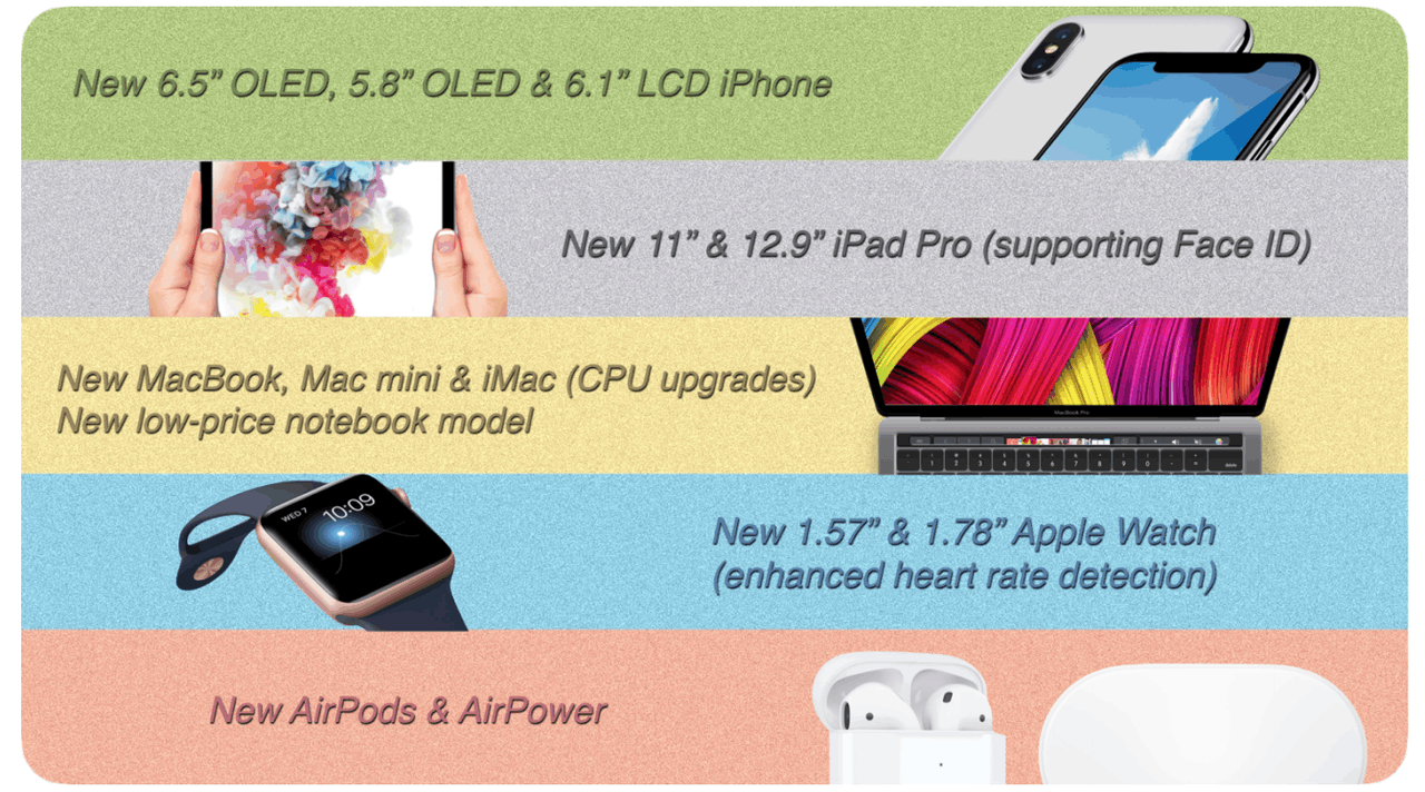 Kuo voorziet ook nieuwe iPads met Face ID met schermdiagonalen van 11" en 12,9", terwijl er ook nieuwe AirPods zouden komen met onder meer een meegeleverd doosje dat draadloos kan laden. Kuo staat bekend om zijn accurate informatie over onaangekondigde Apple-producten, al zijn de voorspellingen van de analist niet altijd uitgekomen.