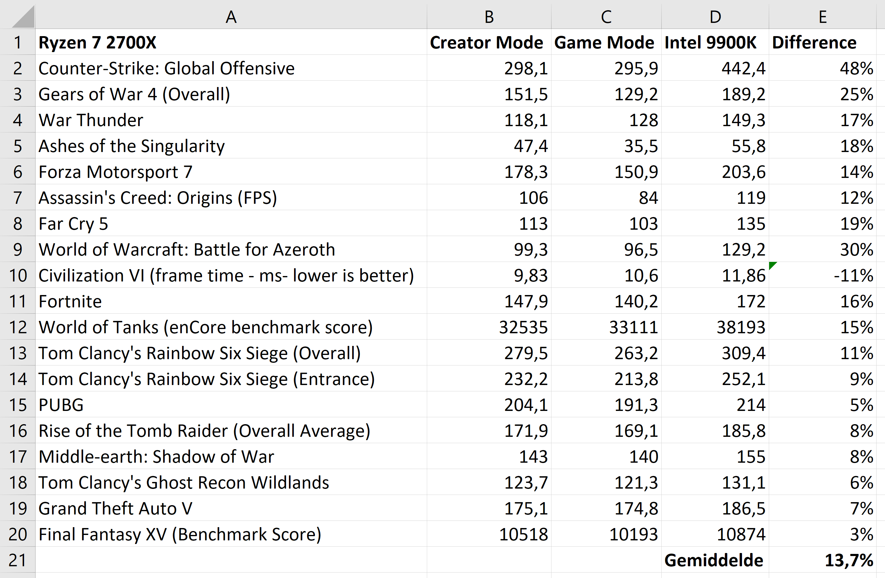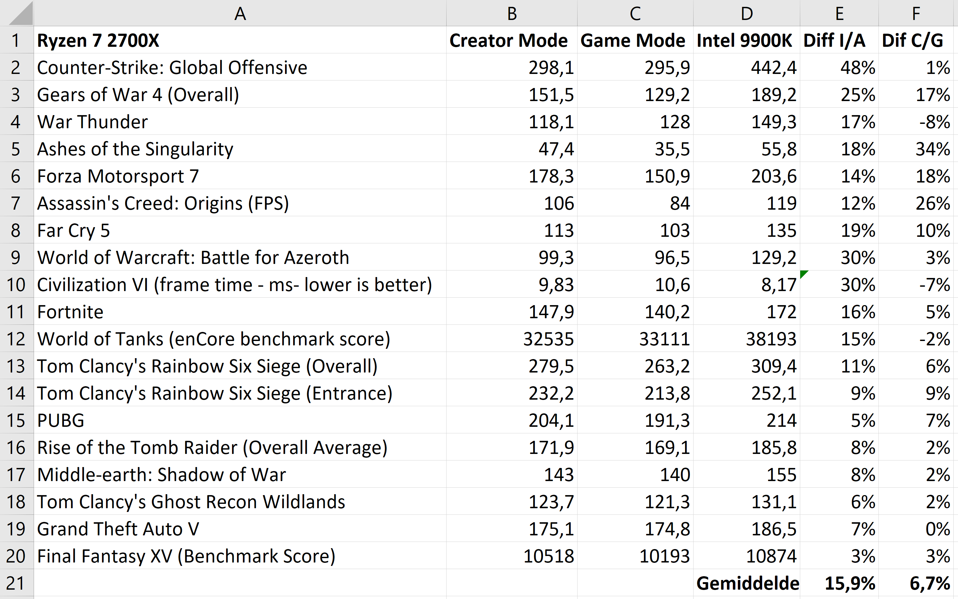 Ook in veel andere games is een soms significant kleiner verschil te zien ten opzichte van de aanvankelijke tests met alleen de Game-modus. In een reactie komt Principled Technologies ook zelf tot de conclusie dat de Creator-modus op de 2700X tot de beste prestaties in games leidt. Het bedrijf verontschuldigt zich voor het weglaten van deze modus in zijn eerste benchmarks. Volgens TechPowerUp is het verschil tussen de twee processors in de nieuwe test gemiddeld twaalf procent ten gunste van het Intel-model.