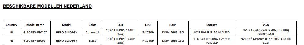 De GL504GV Hero II, tot slot, lijkt op de SCAR II, maar is bedoeld om moba-games op te spelen en heeft ook een minder snelle RTX 2060-videokaart, maar wel een 144Hz-scherm met 3ms responstijd. De Hero II onderscheidt zich door een ander uiterlijk, waarbij de Q-, W-, E- en R-toetsen benadrukt worden, in plaats van de W-, A-, S- en D-toetsen op de SCAR II. De modellen die Asus in Nederland uitbrengt krijgen onderstaande specificaties, welke prijzen daarbij horen is nog niet bekend.