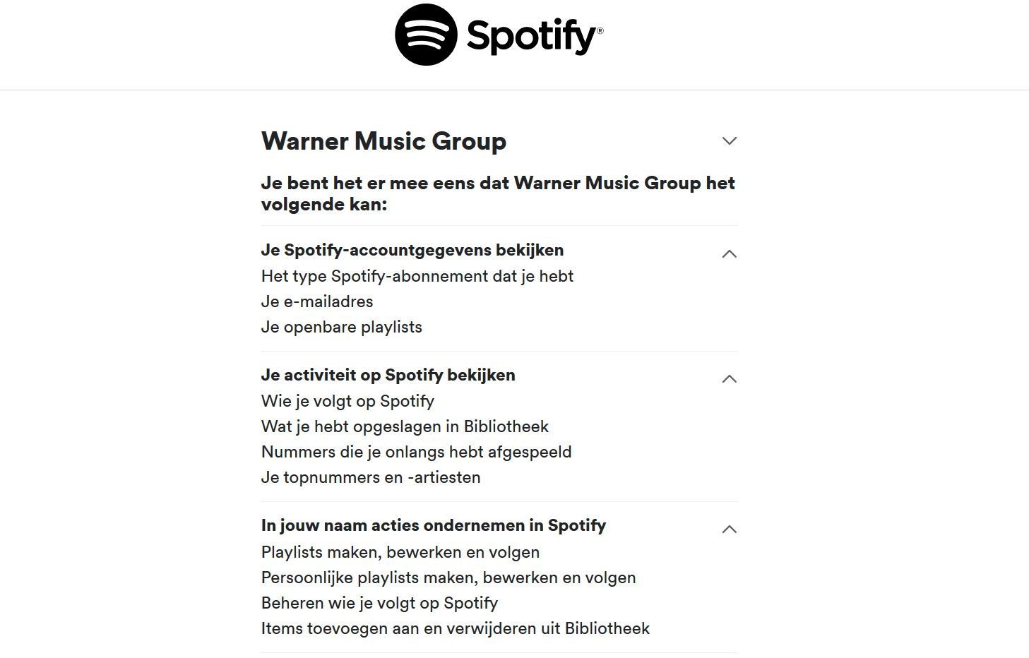 Platenmaatschappijen vragen vaak veel meer permissies dan nodig is als fans muziek willen 'pre-saven' op Spotify. Dan zet de platenmaatschappij een album of single automatisch in de bibliotheek van gebruikers zodra de muziek op het streamingplatform staat.