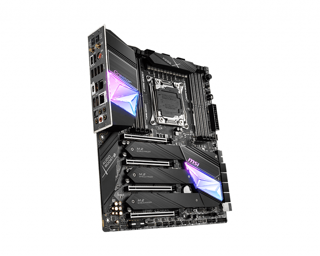 De X299 Pro, X299 Pro 10G en Creator X299 zijn bedoeld voor de komende Cascade Lake-X-cpu's van Intel, maar die gebruiken dezelfde lga2066-socket als hedt-cpu's van de vorige generatie. De Creator X299 is het high-end model van MSI. Dit moederbord heeft een e-atx-formfactor en bevat een stroomontwerp met twaalf fases met een maximale theoretische capaciteit van 90 ampère. De Creator bevat daarnaast drie 8-pins-eps-aansluitingen.