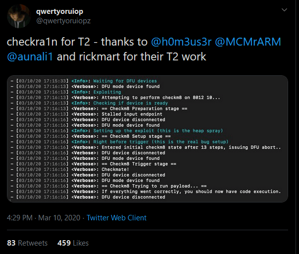 Eén van de leden van het checkra1n-team, dat vooral bekend is van de checkm8-exploit voor enkele iOS-apparaten, maakte de hack kenbaar op Twitter. Met de hack zou het team de T2-chip omzeild hebben. Deze beveiligingschip zit onder andere in Macbook Pro- en Macbook Air-modellen uit 2018 en later, de iMac Pro en de Mac Pro uit 2019. De chip regelt de beveiliging van deze computers, waaronder Touch ID-authenticatie, versleutelde ssd-opslag en secure boot. Volgens Apple functioneert de T2-chip ook als ssd-controller, beeldsignaalprocessor en system management-controller.