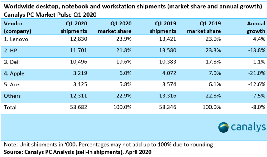 Vooral Apple werd hard geraakt door de afname in pc-leveringen. Het techbedrijf leverde het afgelopen kwartaal 3,2 miljoen computers, een daling van meer dan 20 procent ten opzichte van diezelfde periode in 2019. Lenovo leverde het afgelopen kwartaal de meeste computers met ruim 12,8 miljoen exemplaren. Dat is een daling van ongeveer 4,4 procent. HP volgde met 11,7 miljoen computers. Dat is 13,8 procent minder dan in het eerste kwartaal van 2019. Alleen Dell merkte een groei in het aantal leveringen op. De leveringen van het bedrijf stegen met 1,1 procent naar ongeveer 10,5 miljoen computers.