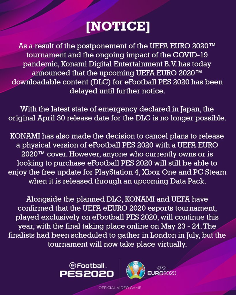Een fysieke release van PES 2020 in combinatie met de dlc, is geschrapt. Vorige maand maakte Konami de releasedatum van 30 april bekend, enkele dagen voordat de UEFA besloot het voetbaltoernooi uit te stellen tot 2021. Nu zegt Konami dat de Euro 2020-dlc niet uitkomt op de genoemde datum, maar dat dit later wel zal gebeuren. Het uitstel heeft te maken met de situatie in Japan, waar de noodtoestand is afgekondigd om het coronavirus te bedwingen.