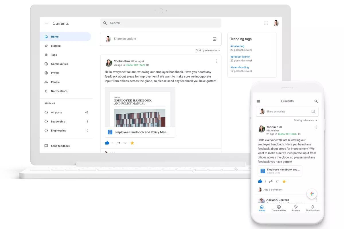 Hoewel de consumentenversie van Google+ al ruim een jaar offline is, bleef de zakelijke variant nog altijd beschikbaar. Daar komt in juli verandering in, zo blijkt uit een mail die Google naar G Suite-admins heeft gestuurd en door Twitter-gebruikers online is gezet. Volgens die mail heeft Currents een vernieuwd ontwerp ten opzichte van Google+ en zijn er extra functies voor gebruikers en admins. Zo kunnen admins straks bepaalde gebruikers moderatierechten geven. Ook kunnen bij Currents berichten worden gesorteerd op relevantie en kunnen inzendingen van bijvoorbeeld directeuren worden gepind.