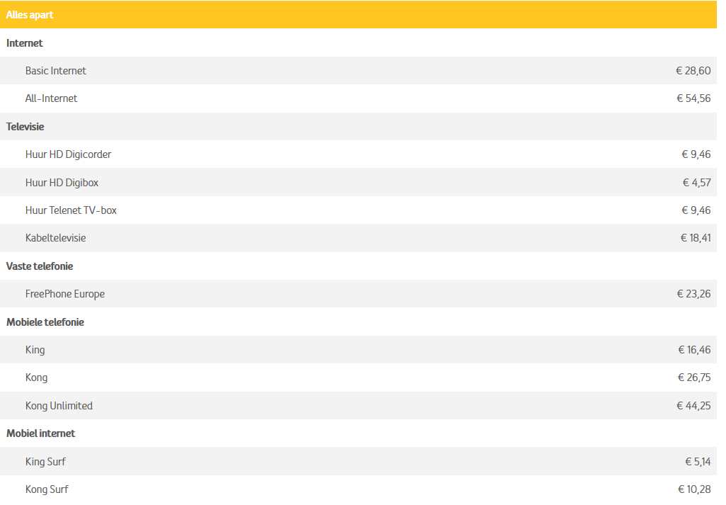 Het gaat om de prijzen van alle alles-in-een-abonnementen in de Wigo- en het Yugo-reeks, en de internetpakketten Basic en All. Ook de prijzen van de huur van Digicoders, Digiboxen en de Telenet TV-box worden hoger. De prijzen van de losse mobiele King- en Kong-abonnementen en het vaste telefoniepakket FreePhone gaan eveneens omhoog. Het gaat in alle gevallen om een verhoging van 1,05 procent, schrijft de provider. De prijsverhoging gaat op 25 oktober van dit jaar in.