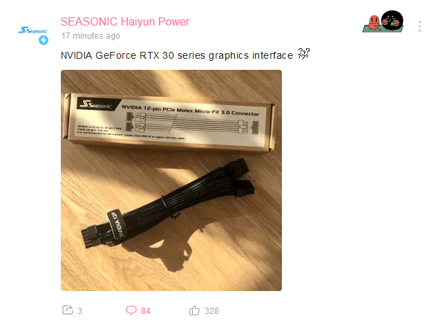Voedingsfabrikant Seasonic heeft een foto gedeeld van een 12-pinsvoedingskabel. Deze kabel zou mogelijk bedoeld zijn voor de 'Nvidia GeForce RTX 30-serie'. Het bedrijf gebruikt deze kabel naar eigen zeggen momenteel 'alleen om te testen'.