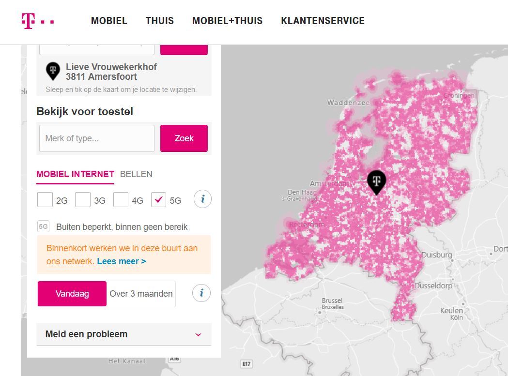 Op de dekkingskaart geeft T-Mobile aan dat de donker en licht magenta gekleurde gebieden goede binnen en buitendekking hebben, en dat de grijze gebieden beperkte dekking buiten hebben. In de praktijk kan dat iets verschillen per toestel, maar zal je in de grijze gebieden geen 5g vinden. Over het algemeen wel 4g en als je aanklikt 4g, 5g + dekking over 3 maanden, dan zal je zien dat zowel aan verdere 5g uitbouw als aan opvulling van enkele kleinere gaten met 4g gewerkt wordt.(ik neem aan dat dit oude Tele2 masten zijn die naar T-Mobile omgebouwd worden en straks ook 5g gaan voeren).