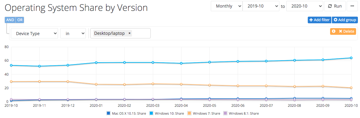 MacOS staat in de analyse op de derde plaats van populaire besturingssystemen, maar met 4,88 procent van de installaties blijft dat ver achter op Windows. Dat is wel voor versie 10.15. Oudere versies, zoals 10.14 en 10.13, zijn apart in de lijst opgenomen, maar hebben aandelen van respectievelijk 1,41 en 1,11 procent. Linux staat ook in de lijst. Ubuntu wordt apart genoemd als distro die op 0,51 procent van de computers draait, en alle andere Linux-distro's zijn verder onder elkaar geschaard en hebben een gezamenlijk aandeel van 1,65 procent. Opvallend is dat ook Windows XP nog steeds is opgenomen in de lijst. Dat draait nog steeds op 0,87 procent van desktops, terwijl die ondersteuning al in 2014 stopte.