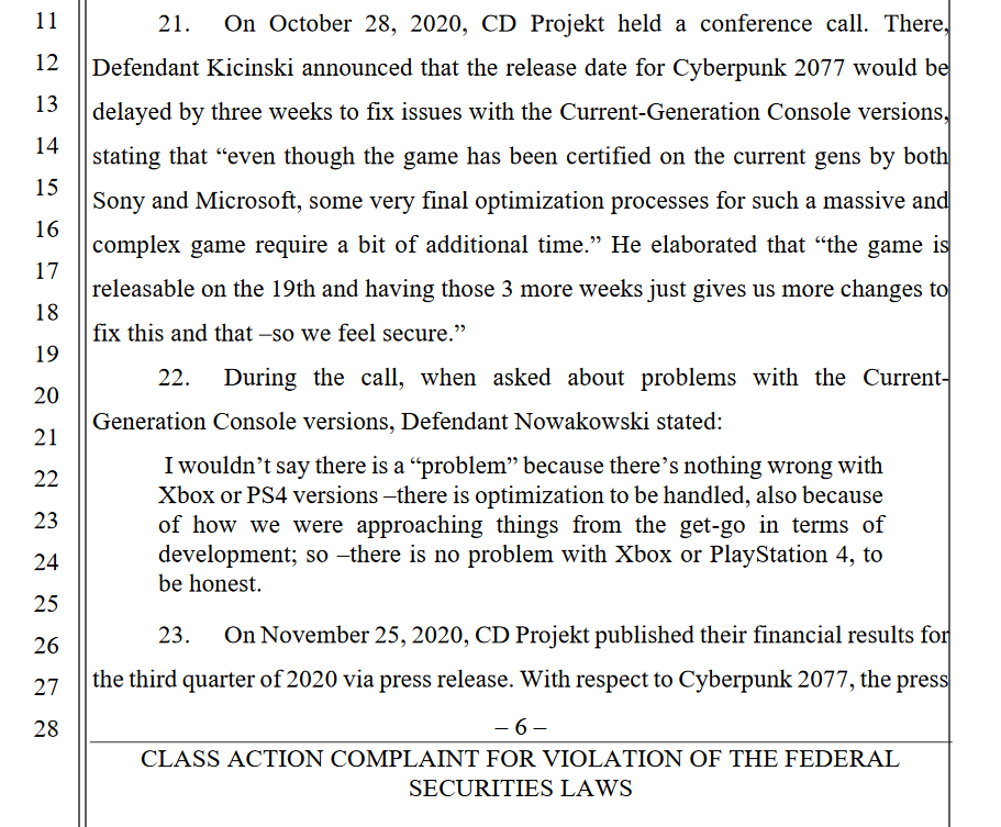 In de aanklacht wordt CD Projekt RED ervan beschuldigd misleidend te hebben gehandeld, omdat niet bekend was dat Cyberpunk 2077 'vrijwel onspeelbaar is op de huidige generatie Xbox en PlayStation-consoles, vanwege een enorme hoeveelheid bugs'. Sony besloot daardoor de game te verwijderen uit de PlayStation Store en zowel Sony, Microsoft, fysieke winkels als CD Projekt RED hebben besloten om kopers hun geld terug te geven als zij dat willen.