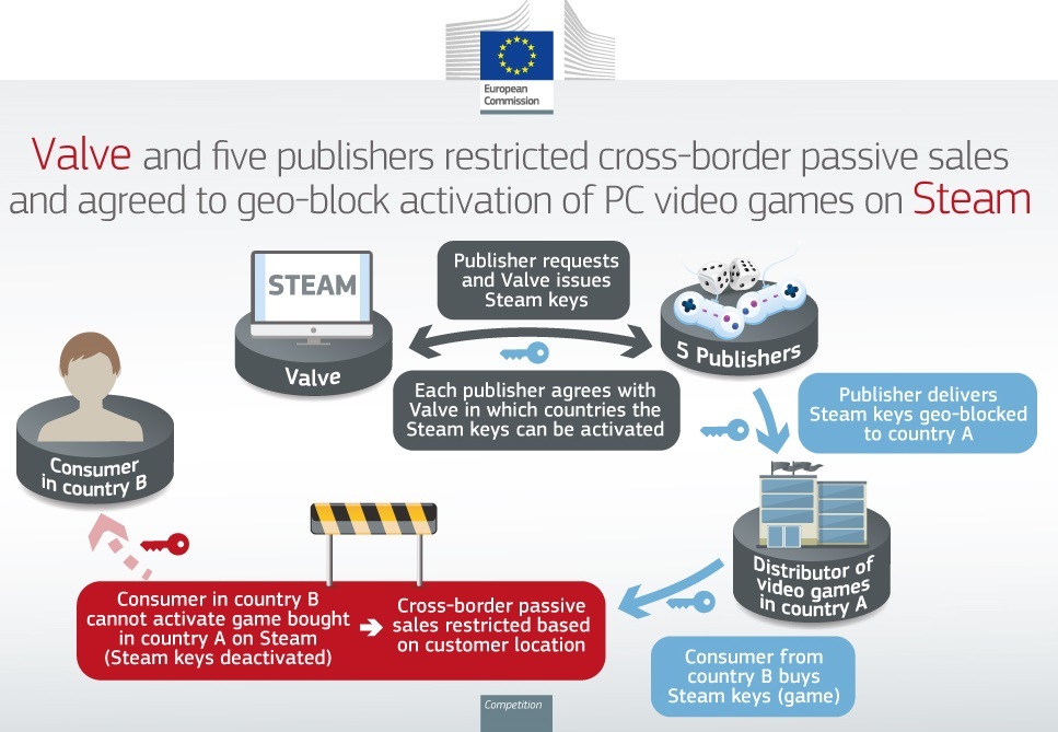 Volgens de Commissie hebben Valve en de vijf andere uitgevers de grensoverschrijdende verkopen van bepaalde pc-games beperkt op basis van de geografische locatie van de gebruikers binnen de Europese Economische Ruimte. Deze geoblockingpraktijken zijn in strijd met de geldende mededingingsregels in de Europese Unie.