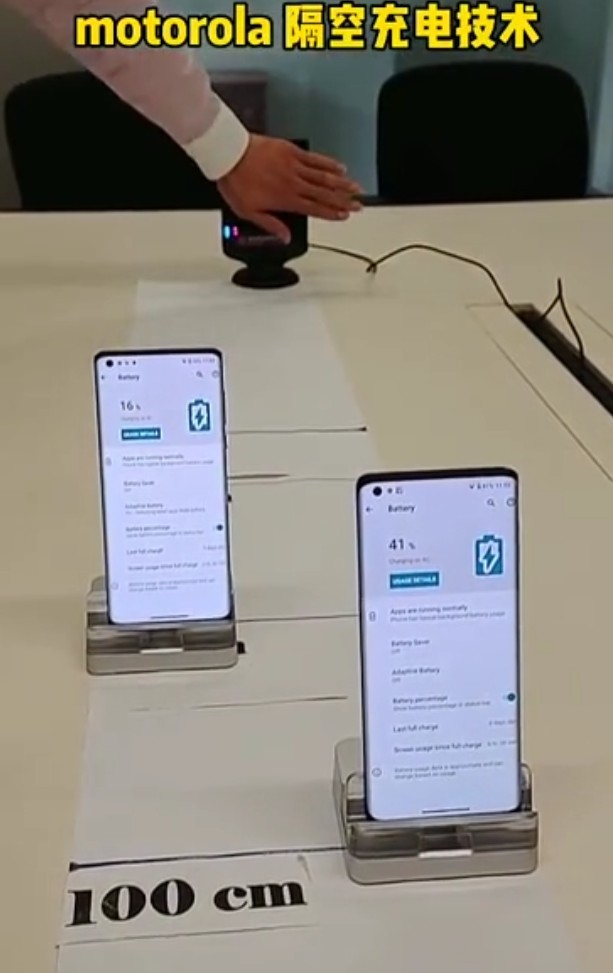 Motorola demonstreert in een video op Weibo hoe twee smartphones draadloos laden op afstand van een vrij compact laadstation. Een smartphone staat op tachtig centimeter van de lader en een ander op honderd centimeter van het station.