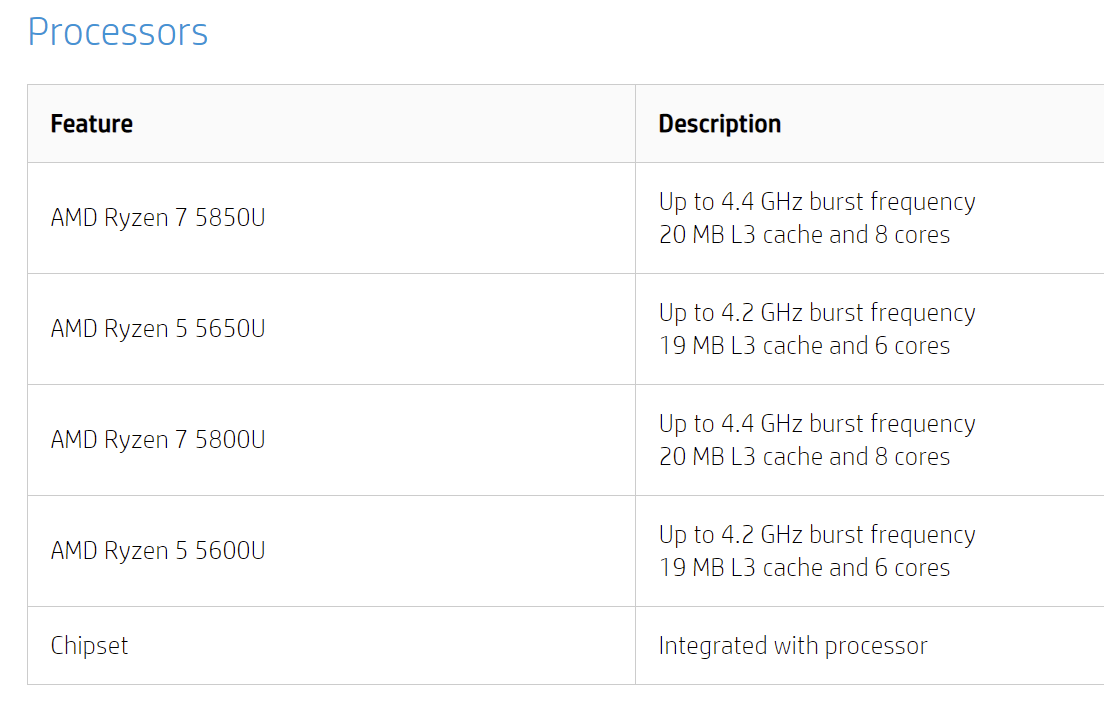 HP meldde ook de komst van een onaangekondigd Ryzen 5 5650U, die vermoedelijk ook beschikt over AMD's Pro-functies. De 5650U is een hexacore-cpu met een turbofrequentie van 4,20GHz en 19MB L3-cache. Ook dit is gelijk aan de reguliere Ryzen 5 5600U. Vermoedelijk is de cpu dan ook gebaseerd op de Zen 3-architectuur en krijgt de cpu ondersteuning voor smt. HP noemt geen specificaties van de geïntegreerde Vega-gpu's in de komende laptopchips, maar het is aannemelijk dat deze ook identiek zijn aan respectievelijk de Ryzen 7 5800U en Ryzen 5 5600U.