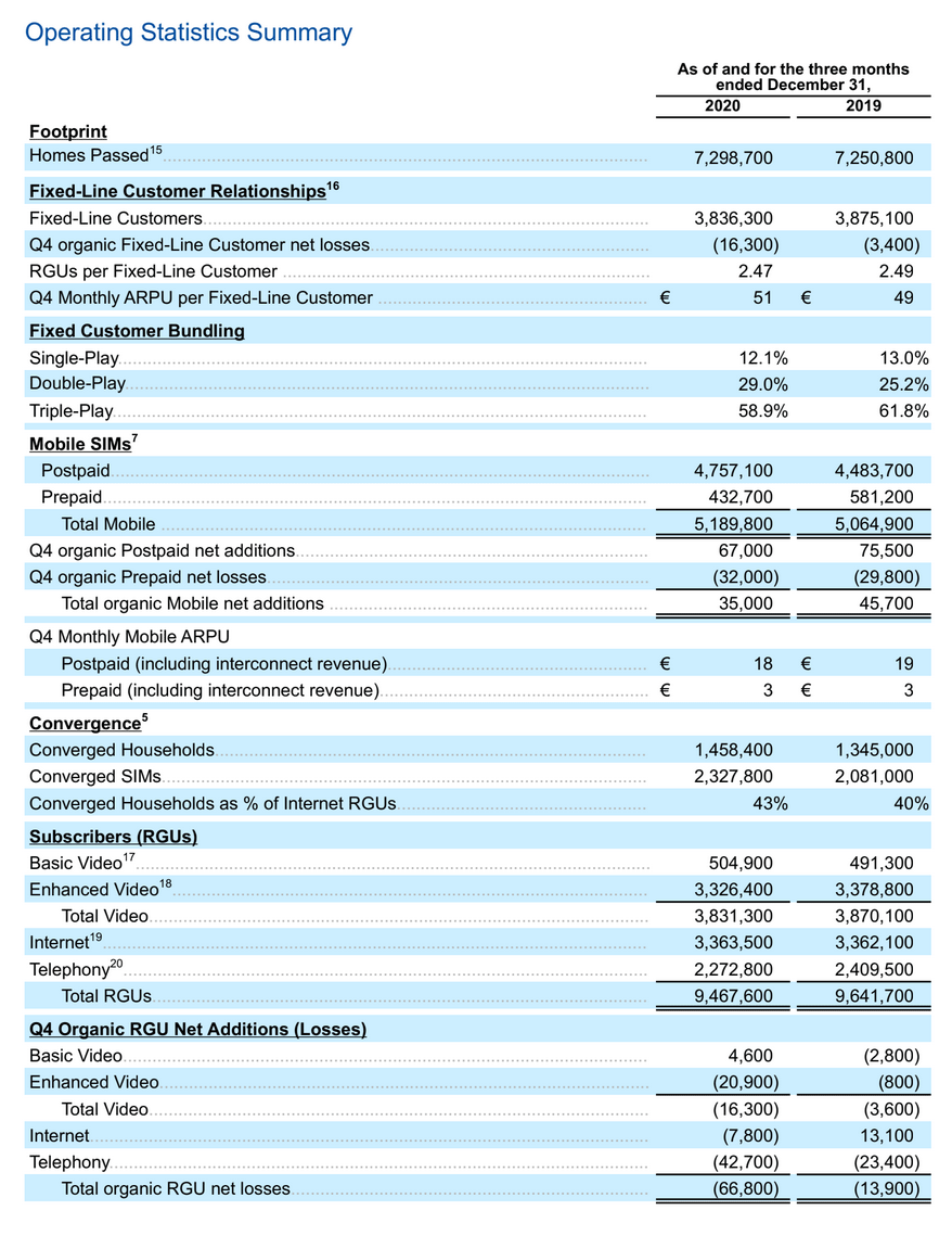 Het aantal abonnees van vaste diensten bij VodafoneZiggo nam dus iets af, maar de provider kreeg er meer mobiele abonnees bij. Er waren 4,76 miljoen abonnementen in het vierde kwartaal, een jaar eerder waren dat er 4,48 miljoen. Het aantal prepaidsims nam wel flink af, van 581.200 naar 432.700. Vodafone-abonnees betaalden gemiddeld 18 euro per maand voor hun mobiele abonnement. Een jaar eerder was dat 19 euro. Prepaidklanten betalen gemiddeld drie euro per maand en dat is ongewijzigd.