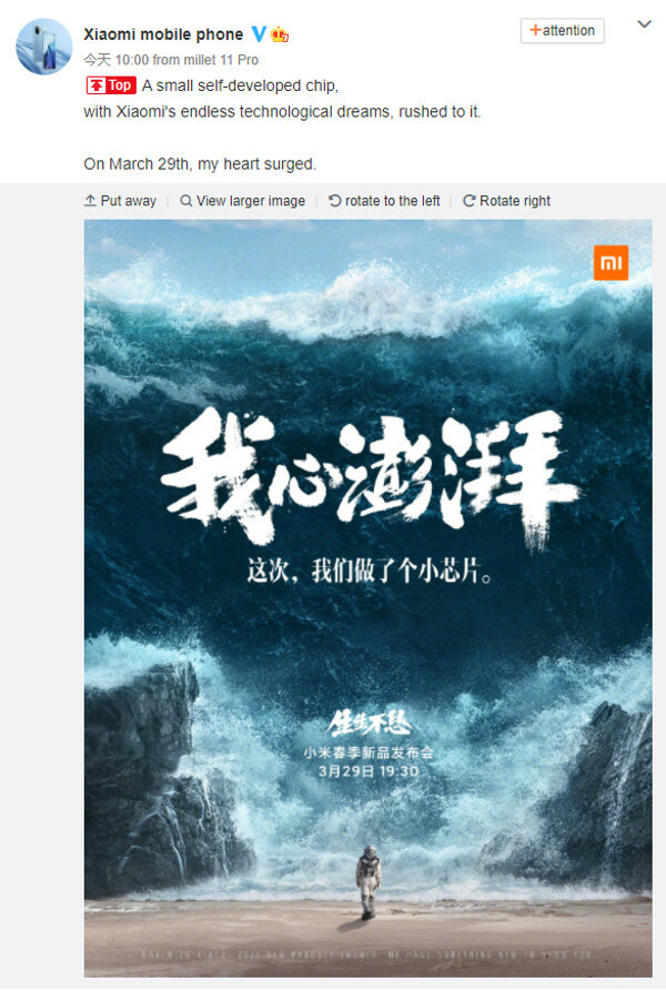 Xiaomi heeft een teaser op Chinees sociale netwerk Weibo geplaatst die lijkt te wijzen op de komst van een nieuwe eigen soc. De post verwijst naar een 'zelf ontwikkelde chip' en gebruikt een Chinees woord dat naar 'Surge' vertaald kan worden. Dat is de naam van zijn vorige, eigen chip.