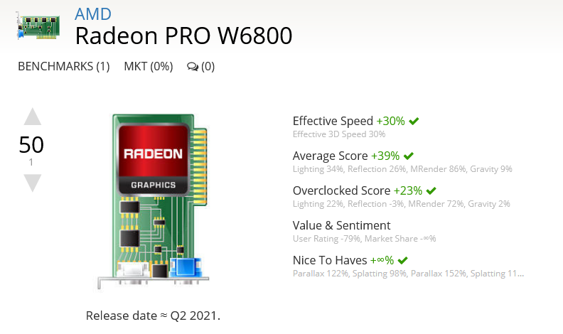 Volgens UserBenchmark presteert de gpu beter dan de Radeon RX 6800, maar gemiddeld minder goed dan de hoger gepositioneerde RX 6800 XT. Deze resultaten zijn echter nog onbevestigd en dienen dan ook met een korrel zout genomen te worden.