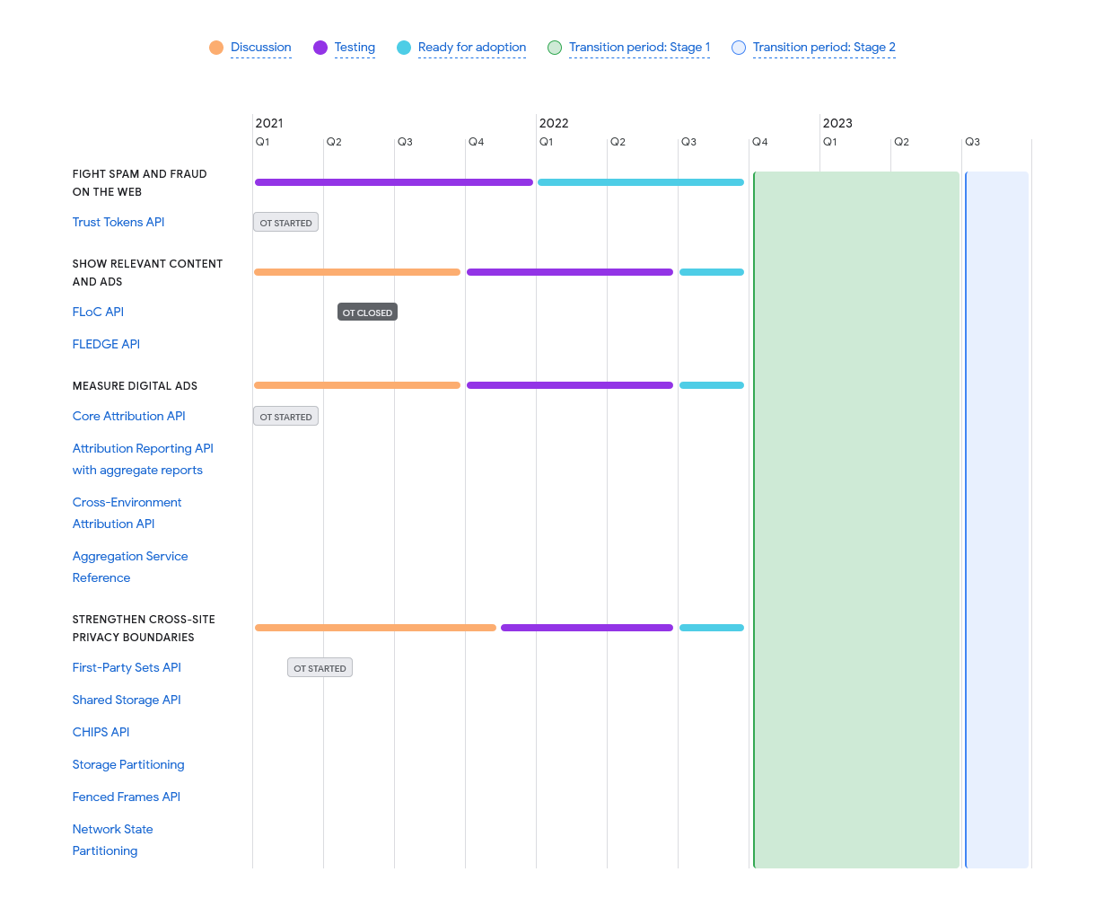 Google verwacht dat alle api's uit de Privacy Sandbox in het vierde kwartaal van 2022 'gereed zijn voor adoptie'. Daarop volgt een periode van enkele kwartalen, waarin Chrome de adoptiecijfers en feedback bijhoudt, voordat het overgaat op de laatste overstapfase. Die moet in het derde kwartaal beginnen en tot eind 2023 duren. In die fase wordt ondersteuning voor cookies van derde partijen uit de Chrome-browser verwijderd, waarmee alle Chrome-gebruikers dus volledig worden overgezet op FLoC.