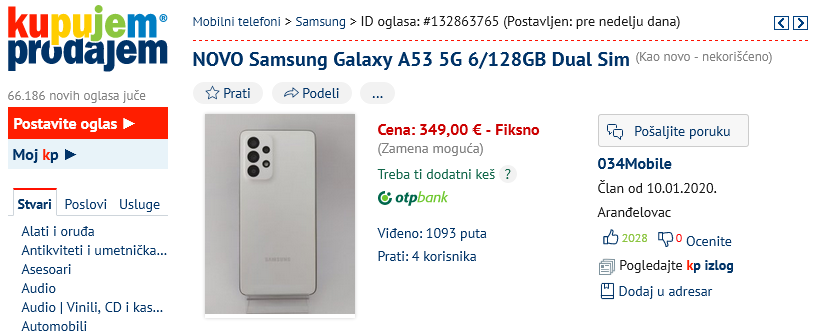 De Samsung Galaxy A53 wordt aangeboden op een marktplaatswebsite in Servië. Het toestel komt volgens de verkoper eind maart uit. Samsung heeft het toestel nog niet aangekondigd. Het uiterlijk komt overeen met wat er eerder op renders was te zien.