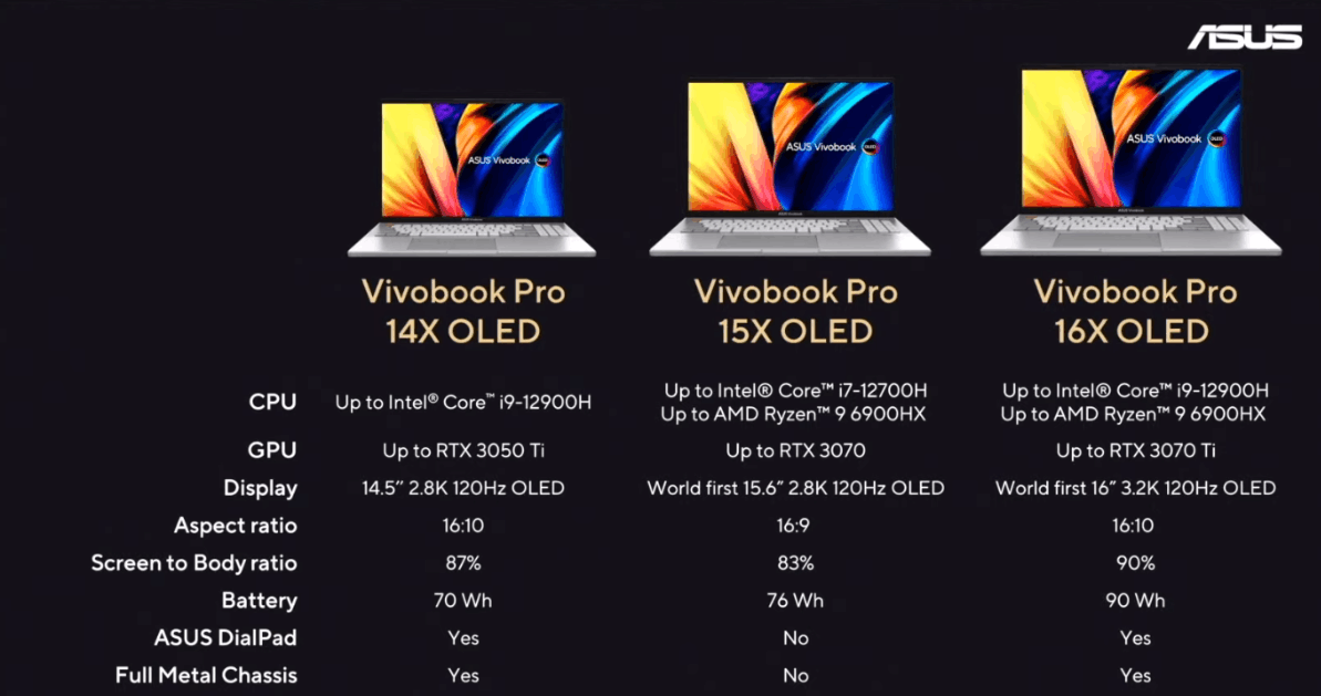 De kleinere Vivobook Pro 14X heeft maximaal een RTX 3050 Ti-videokaart en wordt enkel als Intel-uitvoering geleverd, met maximaal een Core i9-12900H. De 15X heeft opties die vergelijkbaar zijn met die van het grootste model, maar een kleinere accu en maximaal een RTX 3070.