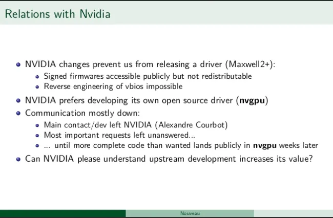 De driver is ook nog niet klaar om algemeen upstream in de Linux-kernel te worden opgenomen. Wel zegt Nvidia dat de driver direct kan worden gebruikt op Ubuntu en de enterprisedistro's van SUSE. Ook wordt er gewerkt aan een upstream release voor Red Hat. Nvidia plaatst de drivers online onder een GPL/MIT-licentie, wat betekent dat ook anderen de modules mogen verspreiden. Nvidia heeft de broncode van de R515-driver inmiddels op GitHub geplaatst.