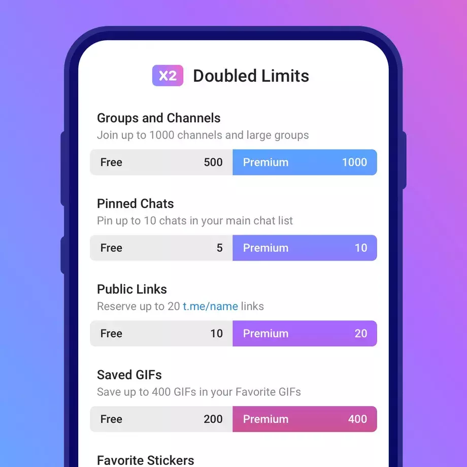 Telegram verdubbelt naar eigen zeggen 'bijna alle limieten' voor Premium-gebruikers. Betalende abonnees kunnen daardoor grotere bestanden sturen, meer chats vastpinnen, meer mappen maken, meer accounts aan de app toevoegen en meer stickers favoriet maken. Verder zien betalende gebruikers geen advertenties en krijgen ze speciale icoontjes voor de app.