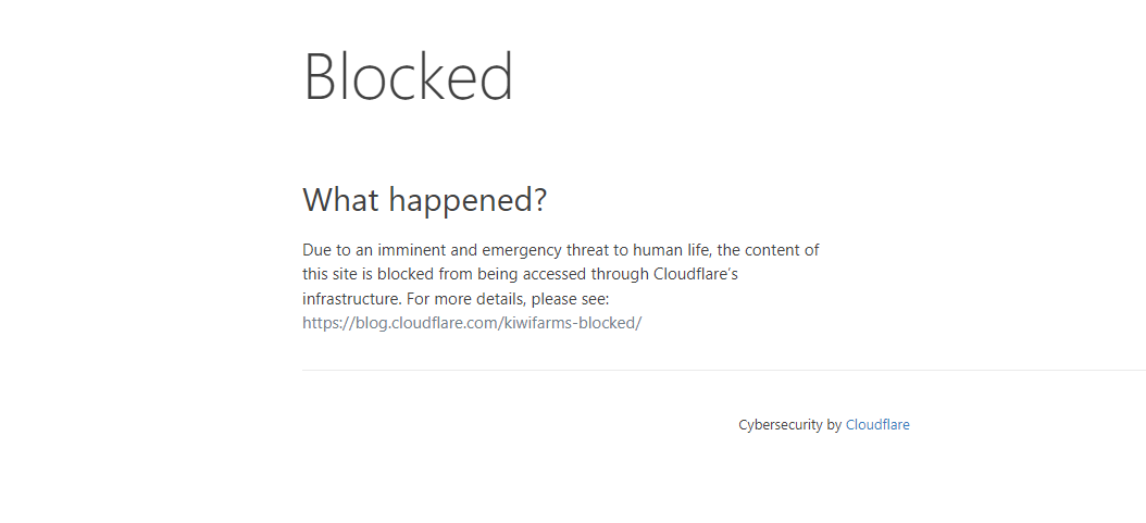 In een verklaring schrijft Cloudflare dat het afgelopen zondag heeft besloten om Kiwi Farms te blokkeren. Volgens Cloudflare zijn de gerichte dreigingen en de retoriek op de site in de 48 uur voorafgaand aan de blokkade sterk genoeg geëscaleerd om de blokkade te rechtvaardigen. Het bedrijf erkent verder dat de site weer online kan komen als het naar een andere provider verhuist. Op de landingspagina is momenteel te lezen dat 'vanwege een onmiddellijke en acute bedreiging voor mensenlevens, de inhoud van deze site niet toegankelijk is via de infrastructuur van Cloudflare.'
