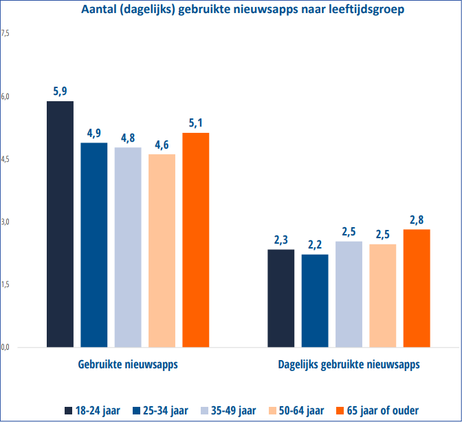 Vooral jongeren gebruiken relatief veel verschillende nieuwsapps, namelijk gemiddeld bijna zes applicaties per gebruiker. Dat betekent overigens niet dat de apps ook daadwerkelijk dagelijks gebruikt worden. Van de ondervraagden gebruikt de groep van 65 jaar en ouder gemiddeld dagelijks de meeste apps, namelijk bijna drie stuks.