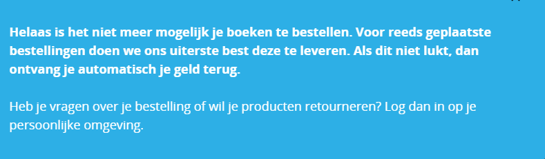 Het is sinds maandagmiddag niet meer mogelijk om op beide sites een boekenbestelling te plaatsen, zoals ook duidelijk in beeld komt als een van de twee sites wordt bezocht. Het bedrijf zegt zijn uiterste best te doen om al geplaatste bestellingen te voldoen en dat klanten hun geld terugkrijgen als de leveringen niet meer lukken. Door het beëindigen van de activiteiten van Studystore komen alle functies gerelateerd aan de website ook te vervallen. Afgenomen licenties en digitaal lesmateriaal zijn gewoon geldig voor de duur zoals is aangeschaft.