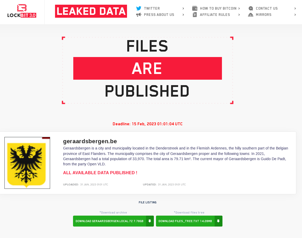 Geraardsbergen werd in september door een ransomwareaanval getroffen; deze werd op 22 september gedetecteerd. Het stadsbestuur probeerde toen de verspreiding tegen te gaan en sloot onder meer het computer- en telefonienetwerk af. Ook werden cybersecurityexperts, de lokale politie en de gegevensbeschermingstoezichthouders ingeschakeld, maar er kon niet worden voorkomen dat gegevens gestolen werden. Lockbit dreigde eind vorige maand met het openbaren van de gegevens en gaf toen 15 februari als deadline.