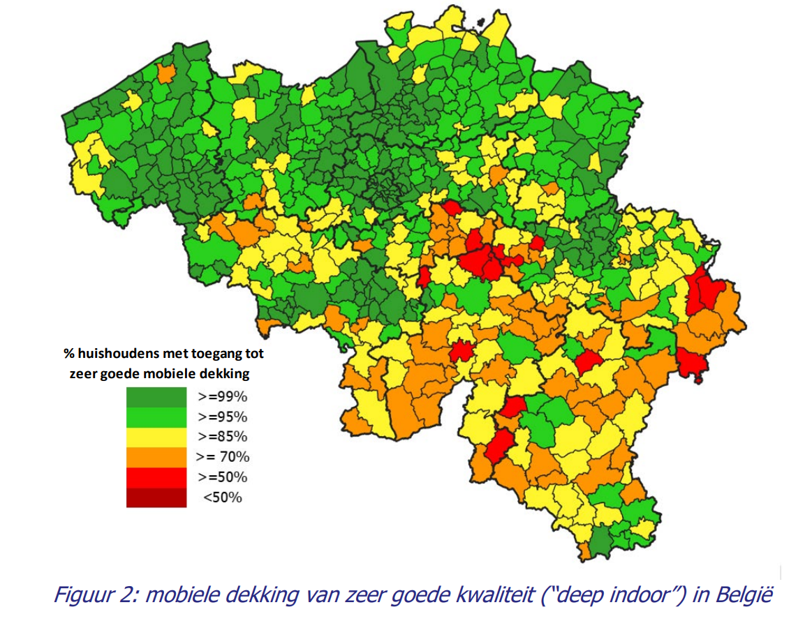 Die dunnere bevolkingsdichtheid van Wallonië heeft ook een impact op de 4G-dekking, al is de impact hier wel iets kleiner. Zo heeft 99,9 procent van de Belgen binnenshuis 4G en heeft 97,3 procent zeer goede 4G-dekking binnenshuis. Vooral in die laatste categorie valt het aandeel in Wallonië iets lager uit.