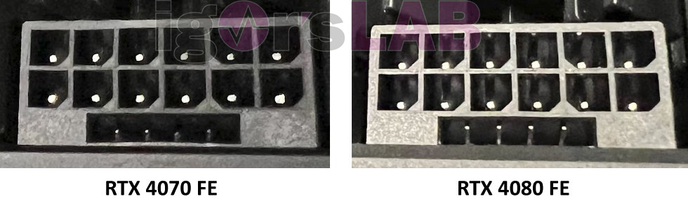 Igor Wallossek denkt dat de GeForce RTX 4070 FE-videokaart al gebruikmaakt van de nieuwe connector, vanwege de vier datapinnen aan de onderkant. Die zijn bij de 12V-2x6 verder naar binnen geplaatst, 1,7mm in plaats van 0,4mm, iets wat hij ook bij de 4070 FE ziet. Ook bij de custom MSI RTX 4070 Gaming X Trio-variant ziet hij het nieuwe ontwerp, al staat op het label nog steeds 12VHPWR H+. Dat terwijl de nieuwere versie het label H++ zou moeten meekrijgen. Het is niet duidelijk waarom deze nieuwe connector naar het schijnt al in massa wordt geproduceerd, terwijl het ontwerp klaarblijkelijk nog niet klaar is.