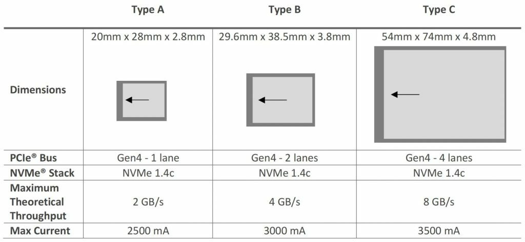 De CFexpress 4.0-kaarten ondersteunen PCIe Gen 4 en NVMe 1.4c. Bij de voorganger, de CFexpress 2.0-standaard, was dit PCIe Gen 3 en NVMe 1.3. Daardoor ondersteunt het grootste Type C-kaartje een theoretische maximale doorvoersnelheid van 8GB/s. Voorheen was dit 4GB/s. Overigens hebben de kleinere kaartjes minder PCIe-lanes, waardoor de theoretische maximale snelheid bij deze kaarten lager ligt.